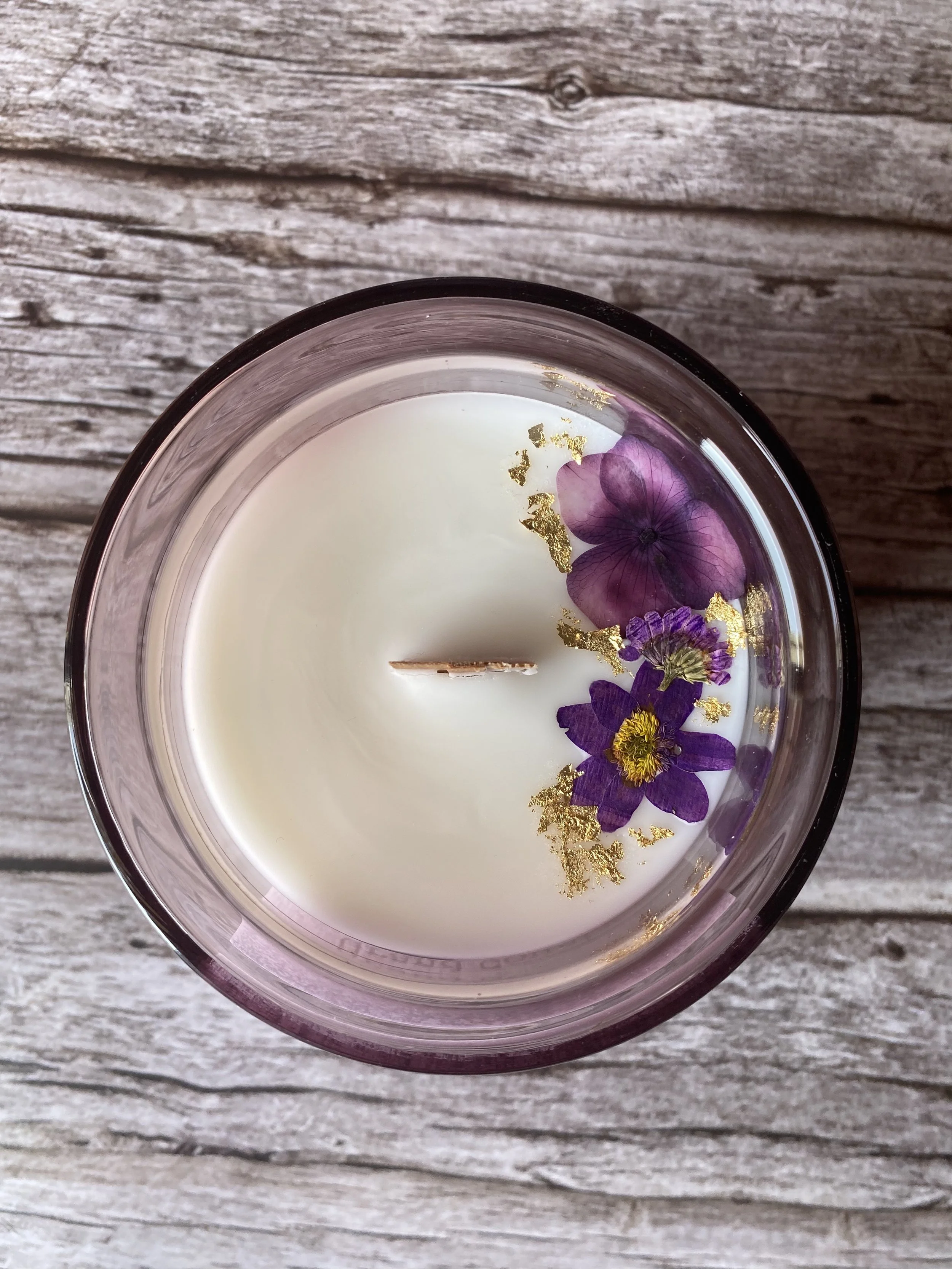 11oz violet translucent, hand-blown double glass vessel with a 55 hour burn time