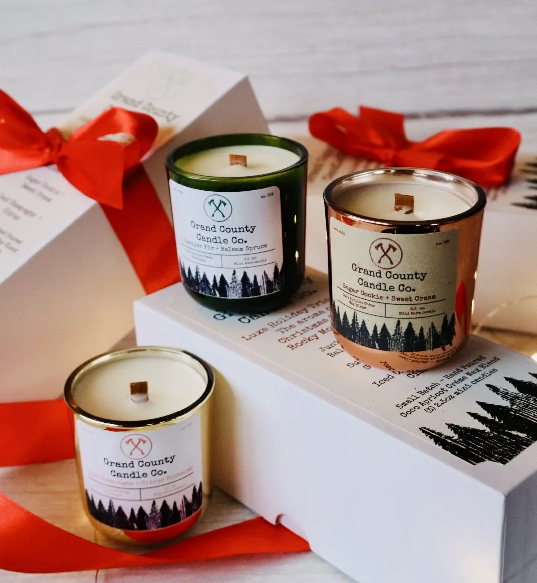 This small batch trio set is the perfect gift set. Each mini Aura burns for 20 hours, burn together for full aroma of Christmas in the Rocky Mountains, or separate times, your preference.